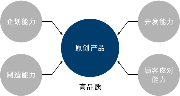 采用了让商品开发的企划,研究负责人各自承担责任,进行开发的责任制。基于反映市场和顾客需求而企划的产品概念,高技术的研究人员承担责任进行对应。通过研究、试作、试验、制造步骤、品质保证,填充之后的品质管理等自始至终的对应,使我们能够将高品质的产品快速的送到顾客的手中。得到原材料制造商的协作,积极地挑战新的原料和新的技术,不满足于历史往绩,而是不断地开发时代先端的新商品。